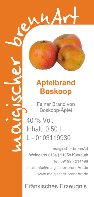Dieser sortenreine Apfelbrand wird von Roten Boskoopäpfel und Schöner aus Boskoopäpfel hergestellt.