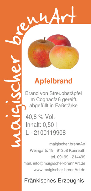 Apfelbrand, hergestellt aus Äpfel unserer eigenen Streuobstwiesen, ausgebaut im Ex-Cognac Holzfass.