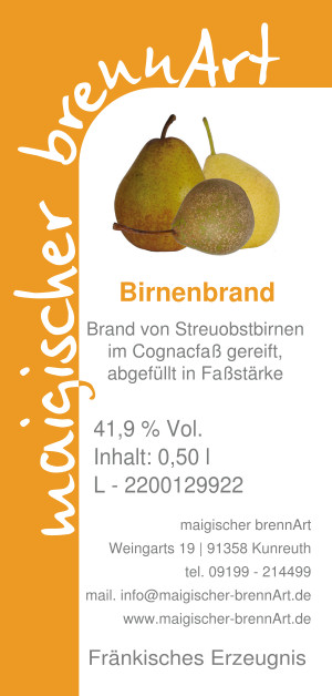 Unser Birnenbrand wurde in einem Ex-Cognacfaß ausgebaut und in Faßstärke abgefüllt, wovon er seine goldgelbe Farbe erhält. Ein Brand mit feiner Frucht, sehr gut im Holz eingebunden.