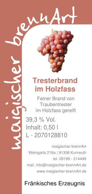 Traubentresterbrand, hergestellt von Gewürztraminer- und Rieslingtrauben aus Sommerach, ausgebaut im Holzfass.